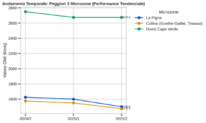Le tre microzone in territorio negativo mostrano percorsi differenti. Mentre la fascia Ovest di Capo Verde ha subito un ricalcolo al ribasso già all’inizio del 2025 per poi stabilizzarsi (rimanendo comunque su valori altissimi, a 2.675 €/mq), La Pigna e Borgo Tinasso mostrano una progressiva erosione del valore su tutti i semestri, rompendo al ribasso la soglia dei 1.600 €/mq. Queste aree richiederebbero verosimilmente incentivi mirati per attrarre nuovi investimenti e invertire il rottame.