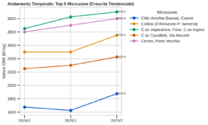 Questo grafico spaccato illustra la solidità della ripresa per le zone “Top Performer”. È interessante notare come Corso Imperatrice e il Centro Storico/Porto seguano un trend rialzista lineare e costante, sinonimo di asset “rifugio” ad alta affidabilità. Al contrario, la linea della zona Città Vecchia/Casinò presenta una forma a “V”, denotando una volatilità più marcata ma con una fortissima capacità di recupero finale che l’ha portata a sfiorare i 1.900 €/mq.