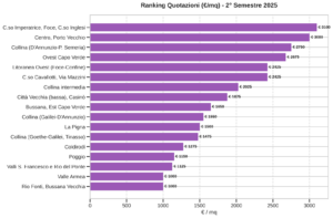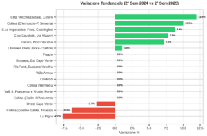 Più contenuta, ma comunque positiva, la dinamica della prima fascia litoranea da Torrente Foce a confine ovest del comune , dove si passa da 2.400 a 2.425 euro al metro quadrato , pari a +1,0% tendenziale e +2,1% congiunturale. Qui il dato sembra più da consolidamento che da accelerazione.